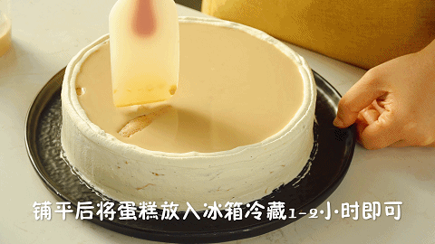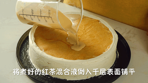 16、将冷却好的红茶混合液倒在千层蛋糕表面,然后用刮刀铺平,接着放入冰箱冷藏2小时即可