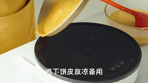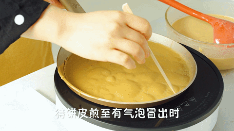 刚开始煎的时候,宝宝们记得不要刻意地去追求薄,因为饼皮稍微厚一点,既不容易烤过头也方便揭下来,太薄的话,很容易就把边缘烤得又硬又脆,后续转移中也容易弄破噢。