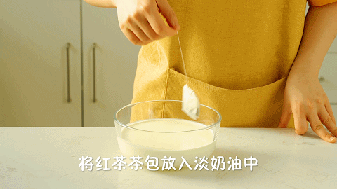 1、往650克淡奶油中放入1包红茶茶包,裹上保鲜膜放入冰箱冷藏2个小时备用(后面用来做奶油夹层)