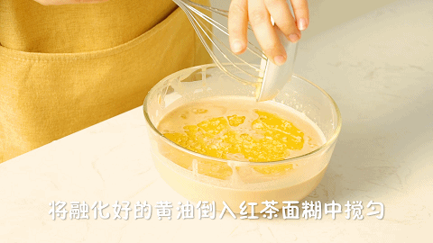 7、将提前融化的25克黄油倒入红茶面糊中搅匀