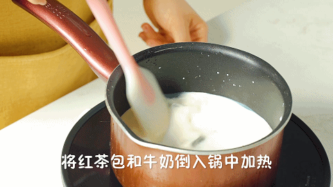 2、现在开始做千层皮:将4包红茶包、460克牛奶倒入锅中小火加热,煮至沸腾后盖上盖子闷10分钟