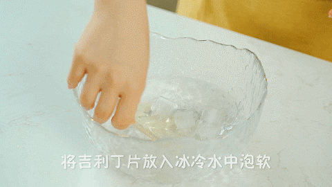 14、现在做奶茶冻:将2克吉利丁片放入冷水中泡软