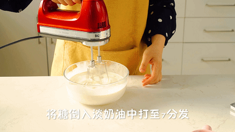 10、现在打奶油夹层:取出步骤1中冷藏好的淡奶油,加入50克细砂糖打至7分发备用