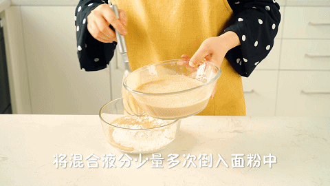 5、将混合液少量多次地倒入150克低筋面粉中,搅拌至顺滑无干粉的面糊状