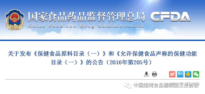 食药总局关于发布《保健食品原料目录(一)》和《允许保健食品声称的保健功能目录(一)》的公告(2016年第205号)