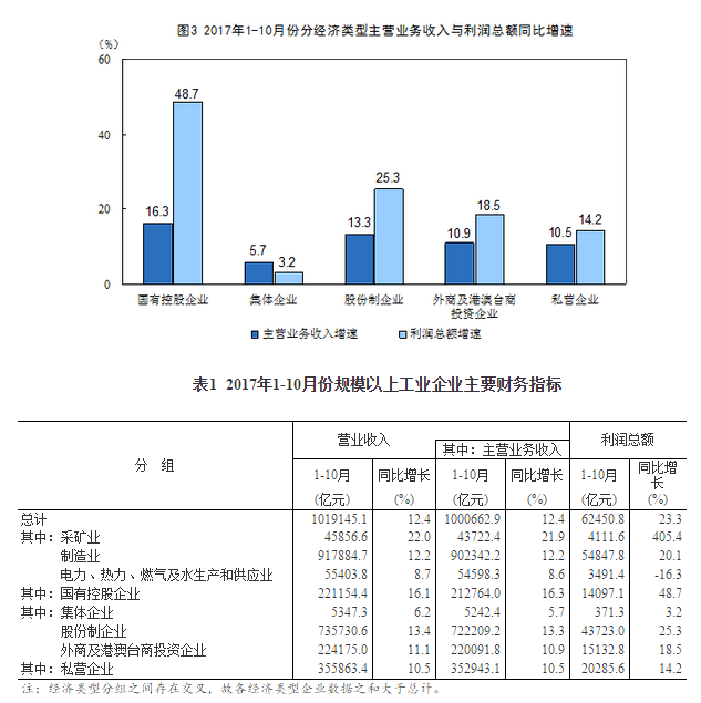 1-10月份,采矿业实现利润总额4111.6亿元,同比增长4.1倍;制造业实现利润总额54847.8亿元,增长20.1%;电力、热力、燃气及水生产和供应业实现利润总额3491.4亿元,下降16.3%。