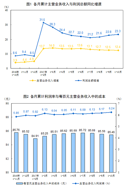 1-10月份,规模以上工业企业实现主营业务收入100.1万亿元,同比增长12.4%;发生主营业务成本85.5万亿元,增长12%;主营业务收入利润率为6.24%,同比提高0.55个百分点。