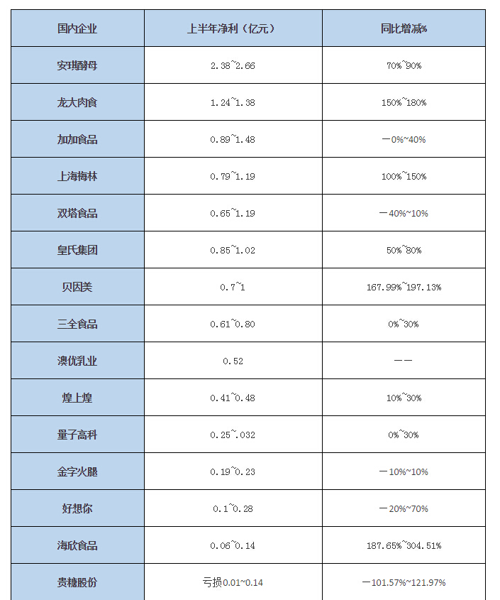 由上表企业可以看出,几乎过半企业预计净利润将实现增长,龙大肉食、上海梅林、贝因美、海欣食品净利润增长甚至超过了100%;而加加、皇氏集团、双塔食品、上海梅林等企业的上半年净利润均将可能超过1亿元。