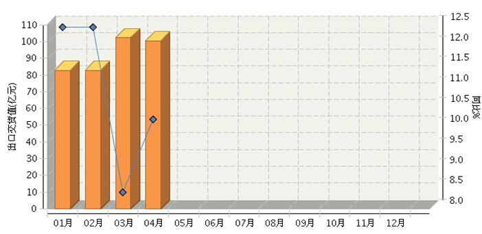 根据国家统计局公布数据,2016年1~4月,全国食品行业累计完成出口交货值同比增长10.62%。其中:1月份完成出口交货值同比增长12.45%;2月份完成出口交货值同比增长12.45%;3月份完成出口交货值同比增长8.39%;4月份完成出口交货值同比增长10.18%。月度数据走势及同比增长情况如下图所示。