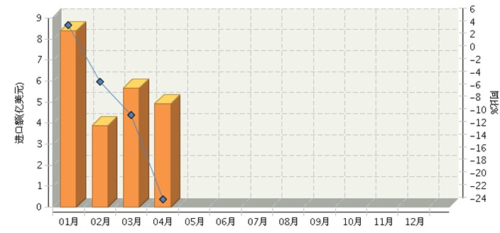 根据海关总署发布数据, 2016年1~4月,全国食品行业累计进口额同比增长-7.34%。其中: 4月份完成进口额同比增长-22.82%。月度进口额及同比增长趋势如下图所示。
