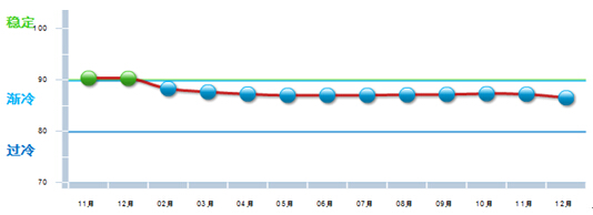 据中国轻工业信息网发布的中轻食品景气指数显示,2015年全年中轻食品景气指数均运行在渐冷区间。