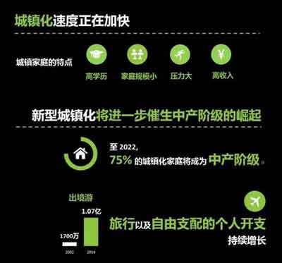 严旋指出,中国城镇化的速度正在不断加快,城镇家庭拥有高学历、家庭规模小、压力大以及高收入的特点。也正是因为中国城镇化的进程不断加快,将推动低线城市增长潜力。他分析,中国城镇化率预计到2020年将从现在的55%提升的60%。“届时,将有超过8亿的城镇人口。至2022年,有75%的城镇家庭将成为中产阶级。这意味着随着他们变成城镇居民有了就业机会和增加收入机会,这些人变成了新的消费主力军。”