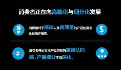 消费者正在向高端化与细分化发展是当今中国消费发展的几大趋势之一。消费者开始逐步追求高品质、安全以及可靠的产品,而价格对于中产阶级来说已经不再成为左右其选择的因素之一,45%的消费者表示他们愿意购买奢侈品因为其更可靠的质量和品质。与此同时,他也指出:消费者开始重视产品带来的自我认同感,对于年轻消费者来说,自我认同和个性变得格外的重要。因此,为了满足更多消费者不同的消费需求,产品细分正在不断深化。