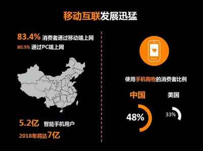 移动互联在中国正在飞速的发展,移动设备也正在成为许多低头族生活中必不可少的一部分。严旋指出:“现有83.4%的消费者通过移动端进行上网,该比例已经超过了通过PC段上网的人数。不仅如此,2018年将有更多的智能手机用户,将从现在5.2亿增长到7亿。” 移动互联的发展也使得使用手机购物的消费者比例大幅增长,达48%,远远超过了美国(33%)。