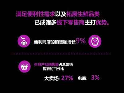 严旋同时提出在生鲜产品方面,线下零售商具有巨大的优势和发展潜力。在大卖场,生鲜产品销售额占总销售额的27%,该比例在电商只有3%。不难发现,相比之下,消费者更愿意选择线下零售商购买生鲜产品。