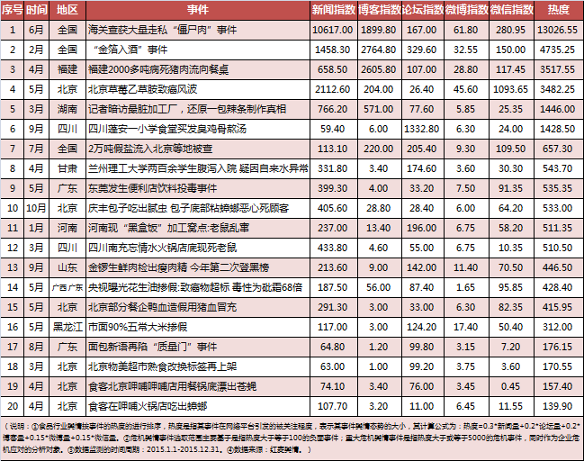 为对2015年食品安全舆情进行回顾, 红麦综合新闻、博客、论坛、微博和微信的数量进行加权核算出热度大于100的前20起影响较大的食品安全舆情事件,并从时间、地域、类型以及媒体曝光渠道等维度进行分析对比,以探讨总结2015年食品行业舆情的特点。