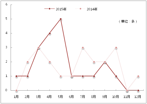从时间分布来看,2015年3月、4月、5月的食品舆情爆发频繁,从单月数量来看,5月份的重大食品舆情达到了5条,也处在全年高峰期,但从6月份开始,食品热点舆情事件的数量逐渐缓慢下降,到了11月、12月,出现重大食品安全和食品质量的事件数量几乎为零(见图1),当然,也反映出食品安全监管的成效有了显著提高。
