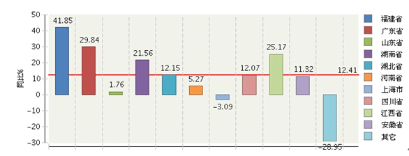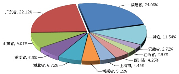 从糖果生产地区分布情况看:产量比重仍集中在福建、广东等地区。其中:福建所占比重最大,共生产52.43万吨,占全国糖果总产量的24.08%, 比去年同期增长41.85%;广东居第二位占22.12%,产量48.17万吨,同比增长29.84%;福建省产量增长最快;上海市同比下降3.09%。