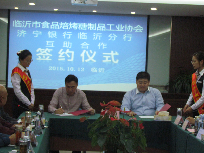 临沂市食品焙烤糖制品工业协会理事长巩大勇与济宁银行临沂分行行长刘彦平签订了互助合作协议。