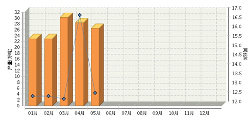 根据国家统计局公布数据, 20151月~5月,全国规模以上糖果企业产量119.75万吨,同比增长11.52%。其中:1月份完成产量22.92万吨,同比增长12.52%2月份完成产量22.92万吨,同比增长12.52%3月份完成产量30.14万吨,同比增长12.38%4月份完成产量28.34万吨,同比增长16.85%5月份完成产量26.43万吨,同比增长12.69%2015年月度数据走势及同比增长情况如下图所示。