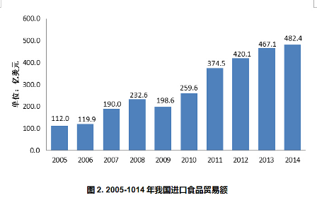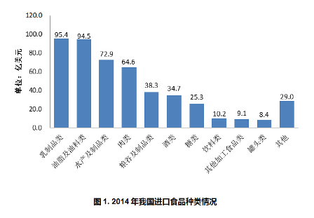 目前我国进口食品的品种几乎涵盖了全球各类质优价廉的食品。 2014 年,我国进口食品贸易额列前 10 位的食品种类分别为:乳制品类、油脂及油料类、水产及制品类、肉类、粮谷及制品类、酒类、糖类、饮料类和其他加工食品类和罐头类,共 453.4 亿美元,占我国进口食品贸易总额的 94.0% 。以植物油、乳粉、肉类、水产品等大宗食品的进口为主。