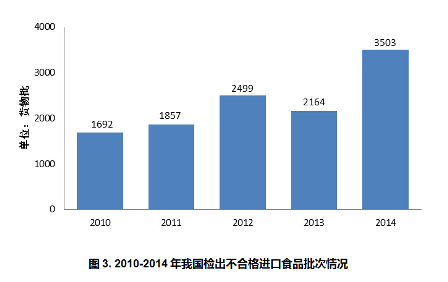 2014 年,我国进口食品贸易额为 482.4 亿,与 2013 年基本年持平(图 2 );检出不合格进口食品 3503 批、 2.4 万吨、 3268 万美元,同比分别增长 61.9% 、 209.1% 和 37.9% (图 3 )。由此可见,进口乳品实行注册管理、特殊剂型食品进口管理加强、检验检疫机构进一步加大监管力度等原因,是 2014 年进口额同比几乎没有增长,但是不合格产品批次增长 60% 以上的主要原因。