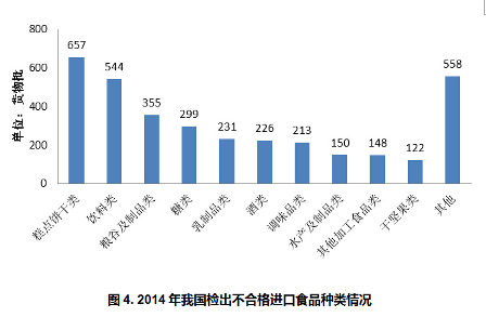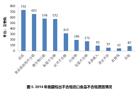 从表 4 、表 5 分析来看, 2014 年我国进口不合格食品主要为糕点饼干、饮料、糖果、乳制品等预包装食品,不合格原因主要是产品品质、食品添加剂、微生物污染、食品标签等原因。其中的食品添加剂、标签不合格等原因,完全可以通过产品的合规性管理来避免。