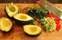2. 牛油果对半切开,去核;辣椒去籽去蒂细细切碎,葱和香菜都细细切碎