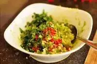 4. 挤入青柠汁,加入现磨海盐,捣成泥