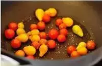 7. 另外用一只锅,放少许橄榄油,放入洗净沥干的小番茄稍微煎至表皮起皱软黏但是又依然保持形态,用少许海盐和黑胡椒调味