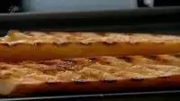 2. 将法棍切去头尾,剖开,每片切成 2-4 段。切面朝下放在烤架上