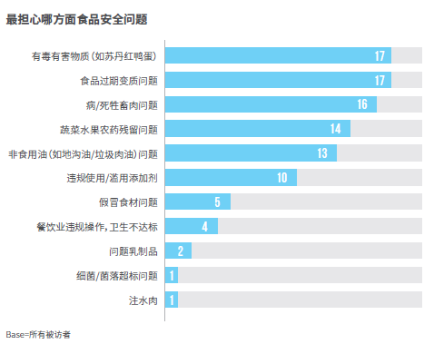 对于具体的食品安全问题,消费者对有毒有害物质、食品过期变质、病 / 死牲畜肉问题、蔬果农药残留、地沟油与违规 / 滥用添加剂给予了较高关注;整体上,生鲜 - 肉类 / 水产类、加工类肉食 / 熟食、乳制品、生鲜 - 蔬菜 / 水果、儿童食品、油炸 / 烧烤类是消费者较关注的食品安全问题食品类别;