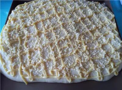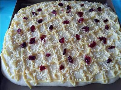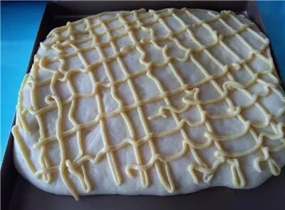 7、最后发酵结束后,取出烤盘,烤箱预热175度。 用叉子在面团上叉一些小眼。 用裱花袋把卡仕达奶油酱交叉挤在面团表面。