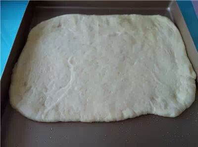 4、将基础发酵后的面团取出,擀平擀薄,放烤盘上(这里用的28×28不粘烤盘,或直接放在铺了油纸的烤箱自带烤盘上)。