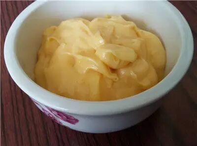 3、面团基础发酵时制作卡仕达奶油酱(食材另备):蛋黄1个,砂糖25g,低筋面粉8g,牛奶70g。方法详见阅读原文风风食谱“卡仕达奶油"。装入裱花袋备用。