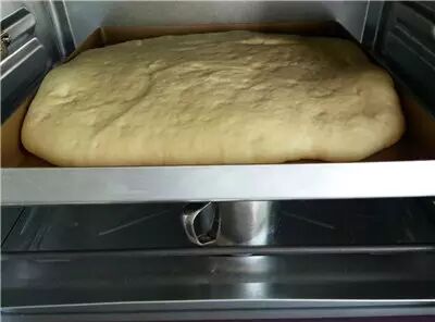 5、放入烤箱按发酵键进行最后发酵。烤箱底部中间加一碗开水,过程中可以开门换一次开水,如果面团表面很干,可以轻轻喷一层水,直到面团发酵到两倍大。
