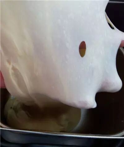 步骤:1、除黄油以外的所有材料混合揉至光滑有筋性,能拉出较厚的膜。加入软化的黄油揉到扩展阶段,能拉出结实的薄膜。