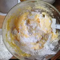 5. 分2-3次将混合过筛的面粉加入步骤3中,用刮刀搅拌。等到面粉的颗粒感完全消失后加入朗姆酒