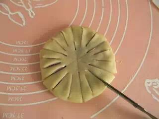 2、注意第二次剪花瓣的时候,只剪上面一层皮,能看到馅料,下层皮不要剪到。