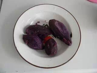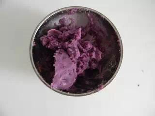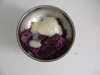 2、蒸熟的紫薯趁热辗成泥,加入奶粉和炼乳。