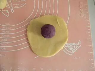14、擀成薄饼。包上做好的紫薯馅。(紫薯馅提前搓成大约25g的小圆球)
