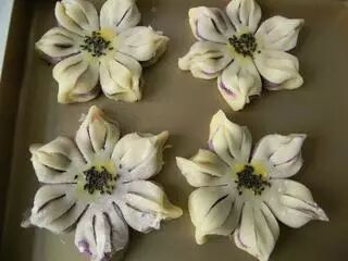 21、都做好,放进烤盘,花心刷上蛋黄液,撒上黑芝麻。