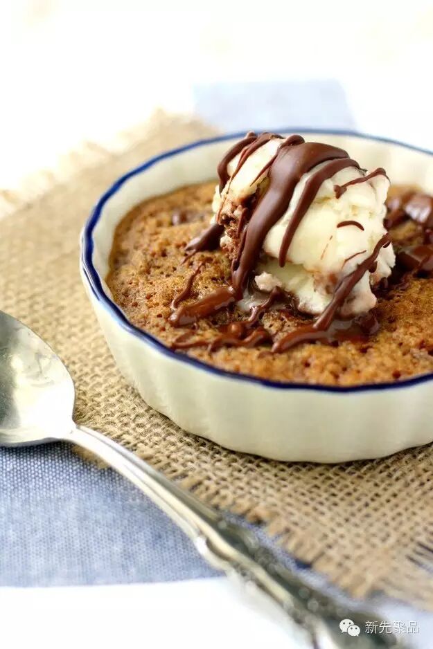 将苹果酱、香草精、素食黄油、糖、无筋面粉、小苏打、盐和巧克力片倒入碗中搅拌融合,将混合物倒入模具中然后用微波炉加热60秒,然后根据个人喜好放上香草冰激凌和巧克力酱。