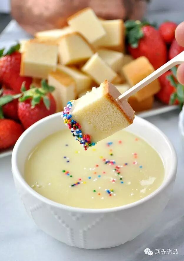 将装有白巧克力碎片的碗放在锅中隔水加热,待巧克力完全融化后倒入少量的香槟,搅拌至融合后倒入碗中,用芝士蛋糕或者水果蘸着酱,然后根据个人喜好撒上一些糖粉即可。