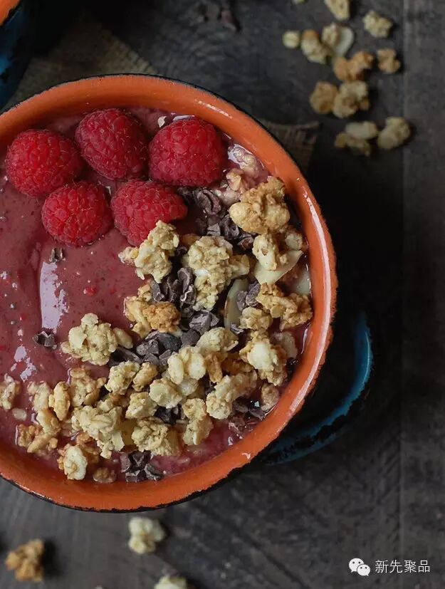将香蕉、覆盆子、杏仁乳、奇亚籽、可可粉和冰块倒入搅拌机中搅拌,倒入碗中后撒上一些麦片、覆盆子和可可碎片。