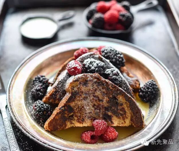 将多脂奶油加热后加入白巧克力搅拌,加一点意大利苦杏酒备用。将鸡蛋、蜂蜜、肉豆蔻粉、焦糖、盐和糖粉倒入碗中搅拌融合,将吐司切成三角形放入碗中蘸满混合物,然后放入预热至190摄氏度的烤箱中烘烤至金黄即可出炉,然后浇上白巧克力酱,撒上糖粉,搭配浆果即可食用。