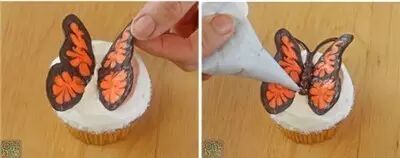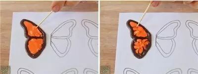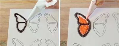 2、黑巧挤出蝴蝶身体的边缘部分,橘巧填充。
