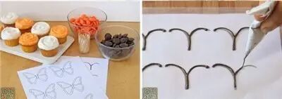 1、准备好黑巧克力豆和橘色的巧克力豆、画好蝴蝶的糯米纸。黑巧挤出蝴蝶的触须,放一旁冷却。